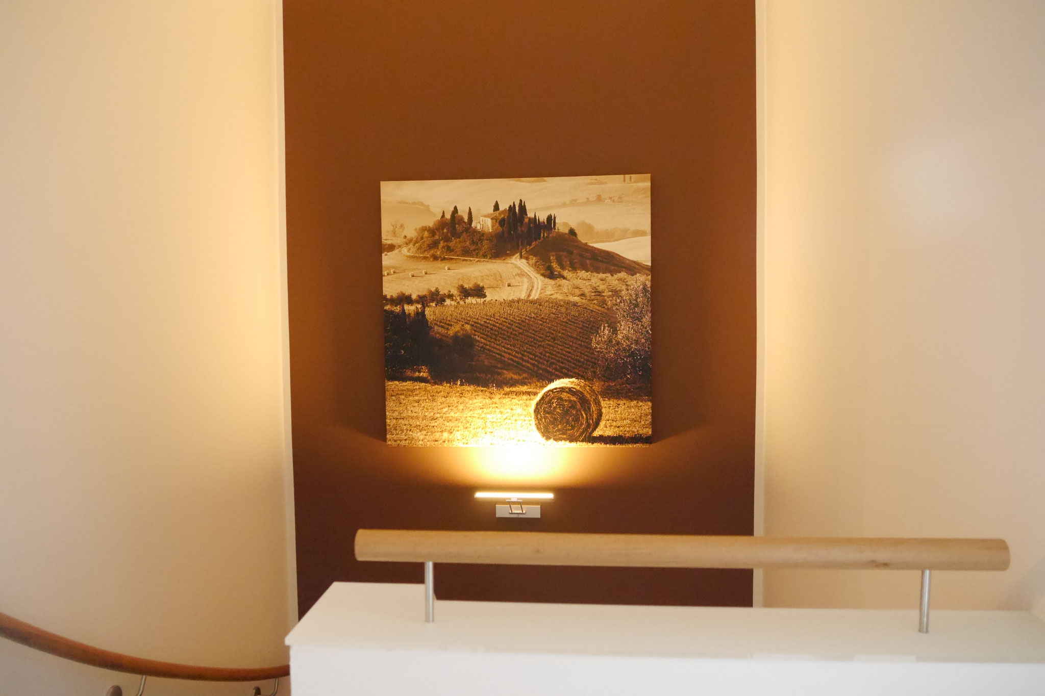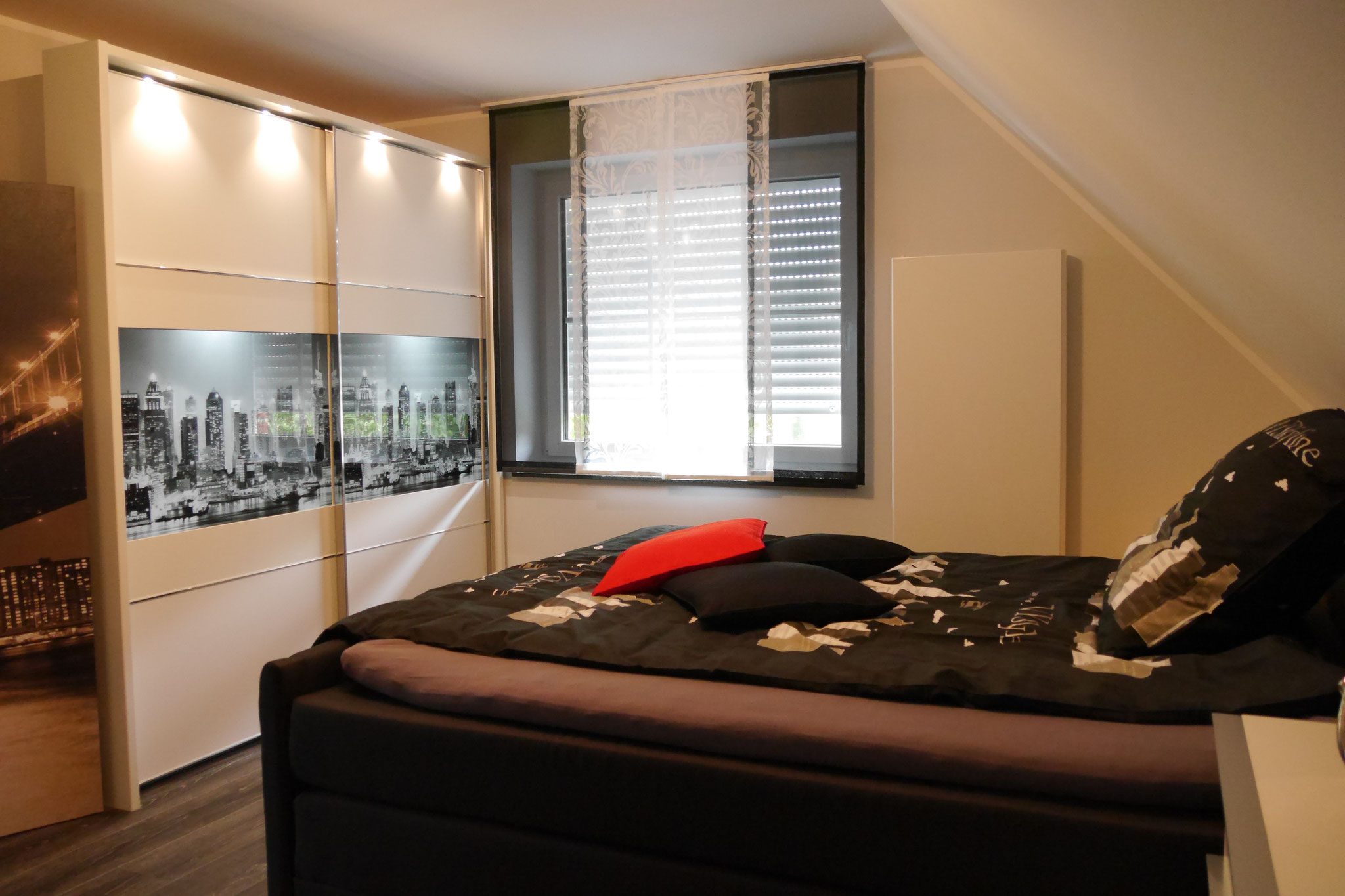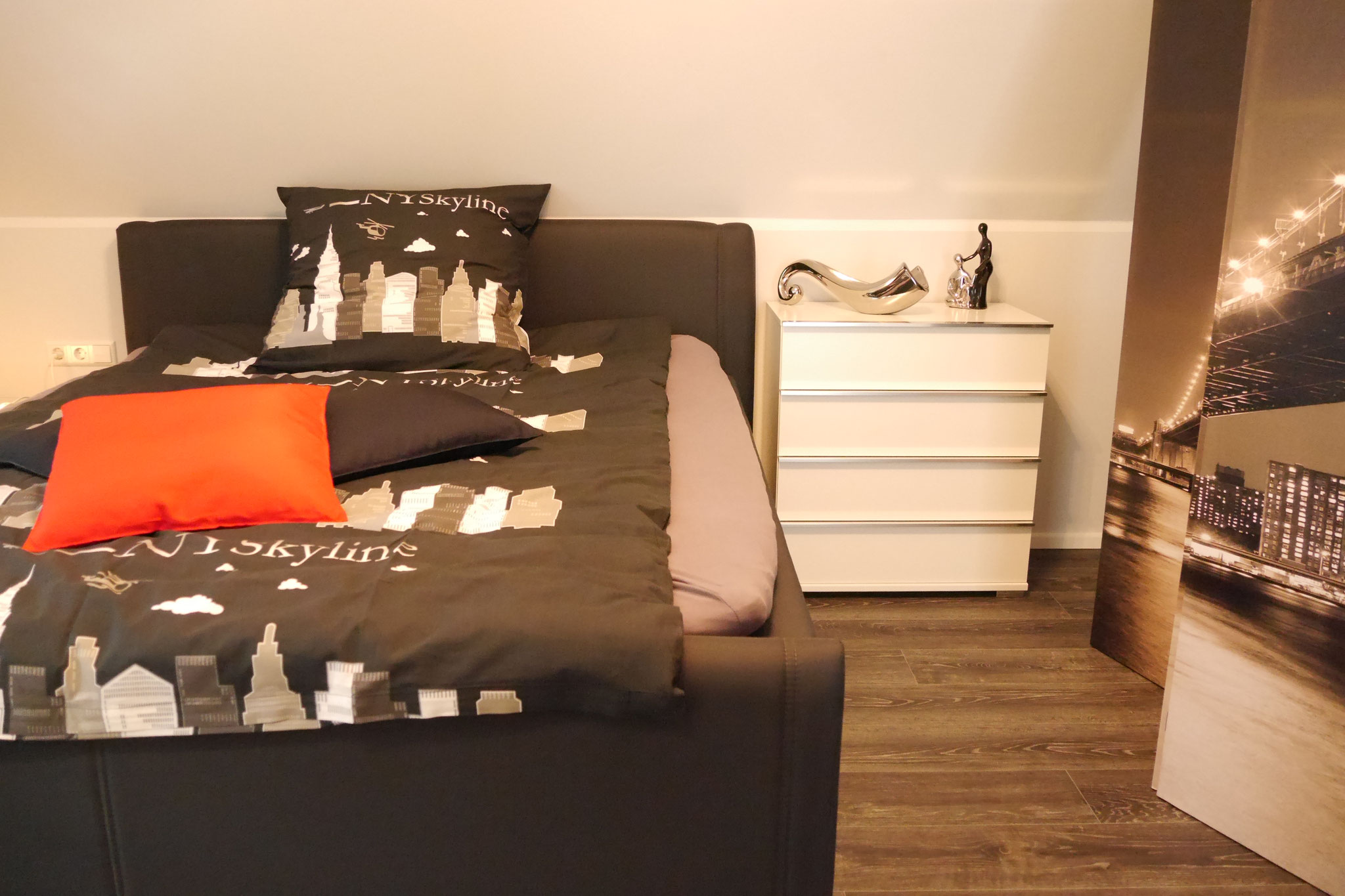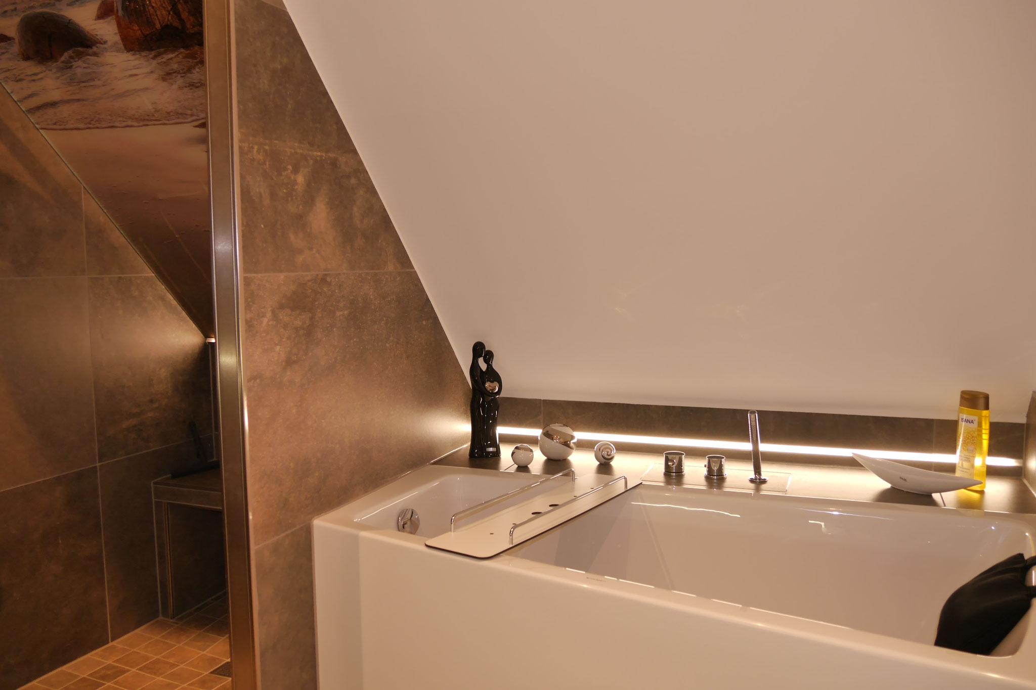 Im Obergeschoss können Sie neben einem geräumigen Schlafzimmer auch ein modernes Bad mit begehbarer Dusche und Badewanne inkl. Soundsystem genießen. Ein kleiner Nebenraum mit zusätzlichem Bett bietet eine weitere Schlafmöglichkeit.