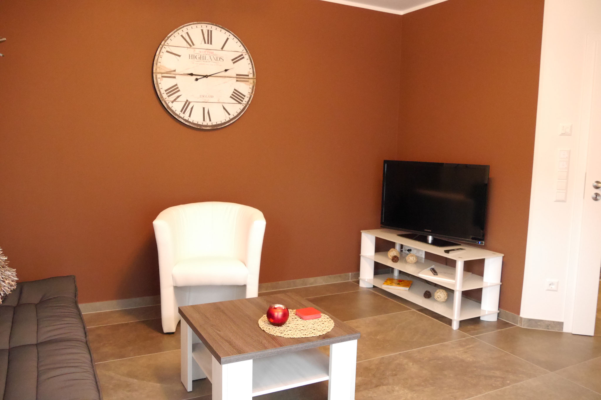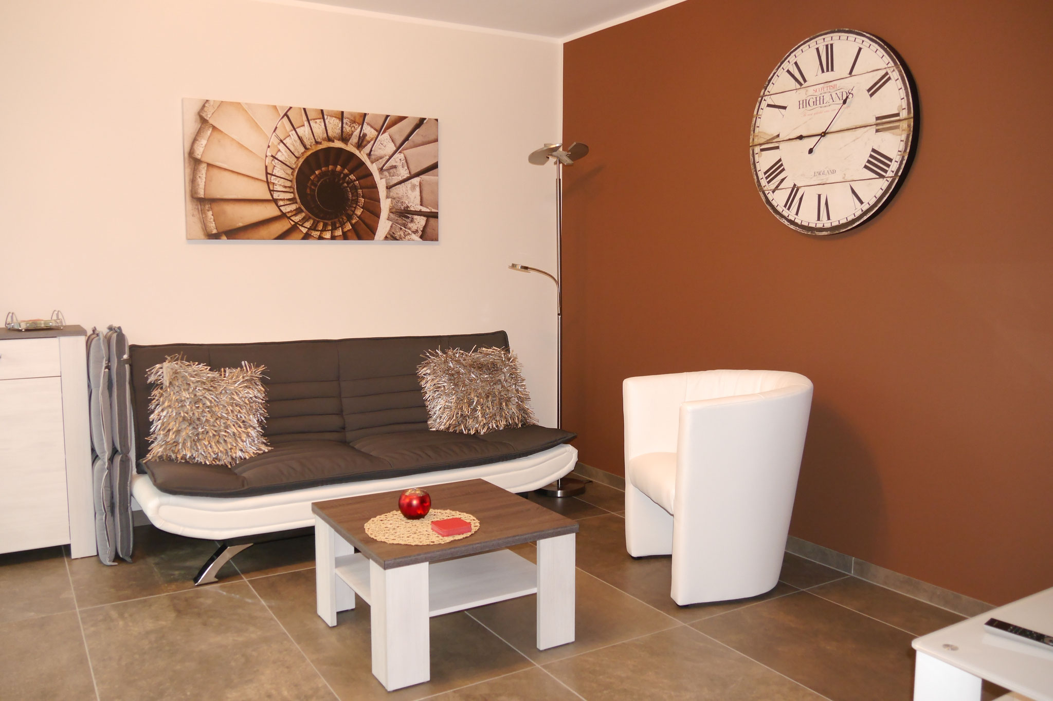 Auf insgesamt 70 m² Wohnfläche befinden sich im Erdgeschoss ein modernes Wohnzimmer mit Zugang zum Garten. Auf einer kleinen Terrasse haben Sie hier auch die Möglichkeit für einen entspannten Grillabend.